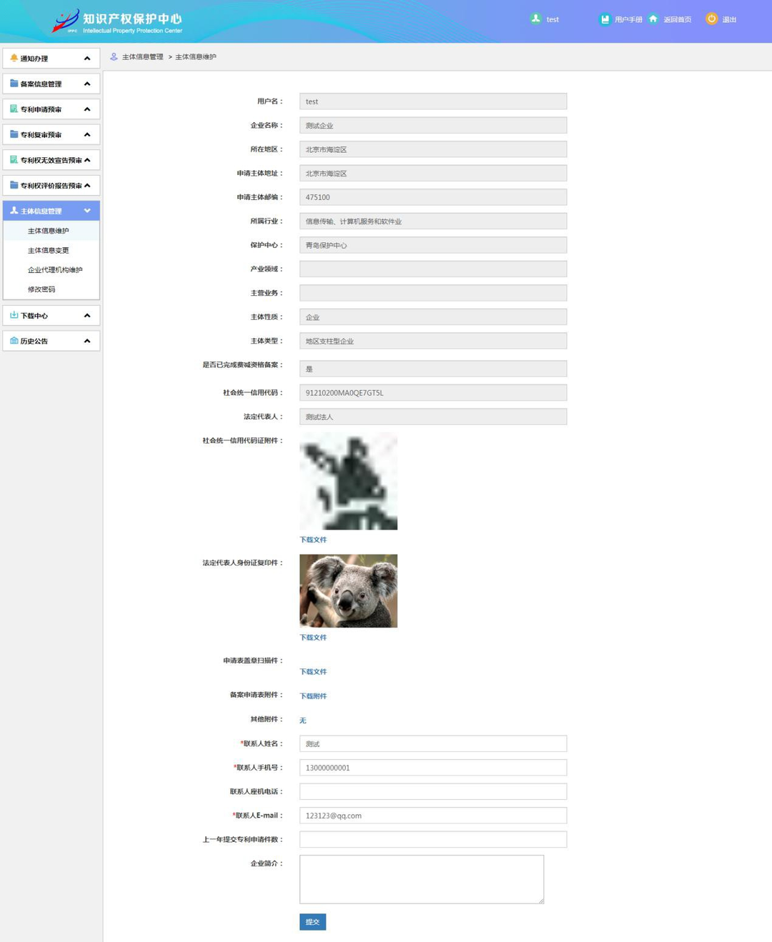 申请主体登录系统以后,可以对企业基本信息进行修改,只允许修改联系人姓名、联系人电话、联系人邮箱、上一年提交专利申请件数、企业简介。邮箱、手机号要符合通用规则。