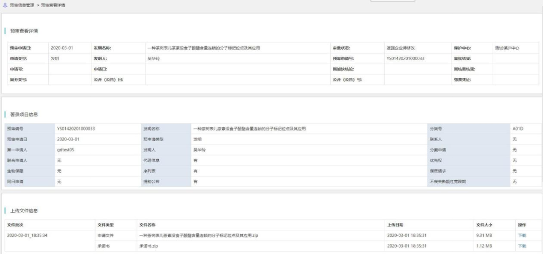 专利申请预审信息查看根据用户权限可查看的不同的专利申请预审信息。申请主体可以查看申请主体和代理机构提交的专利申请预审信息。