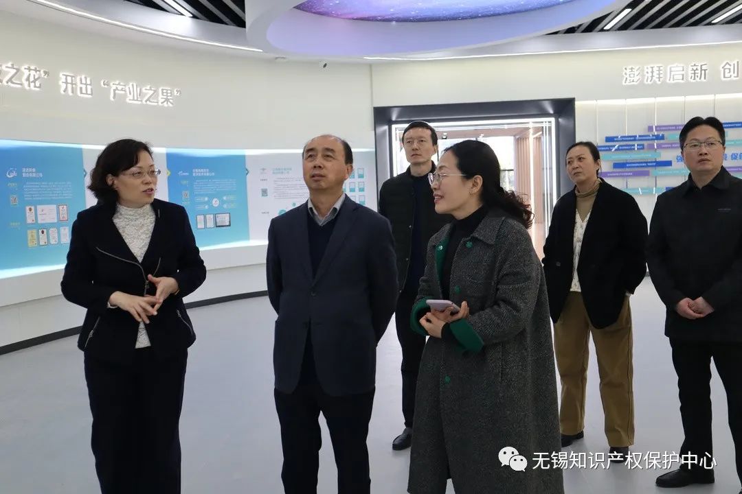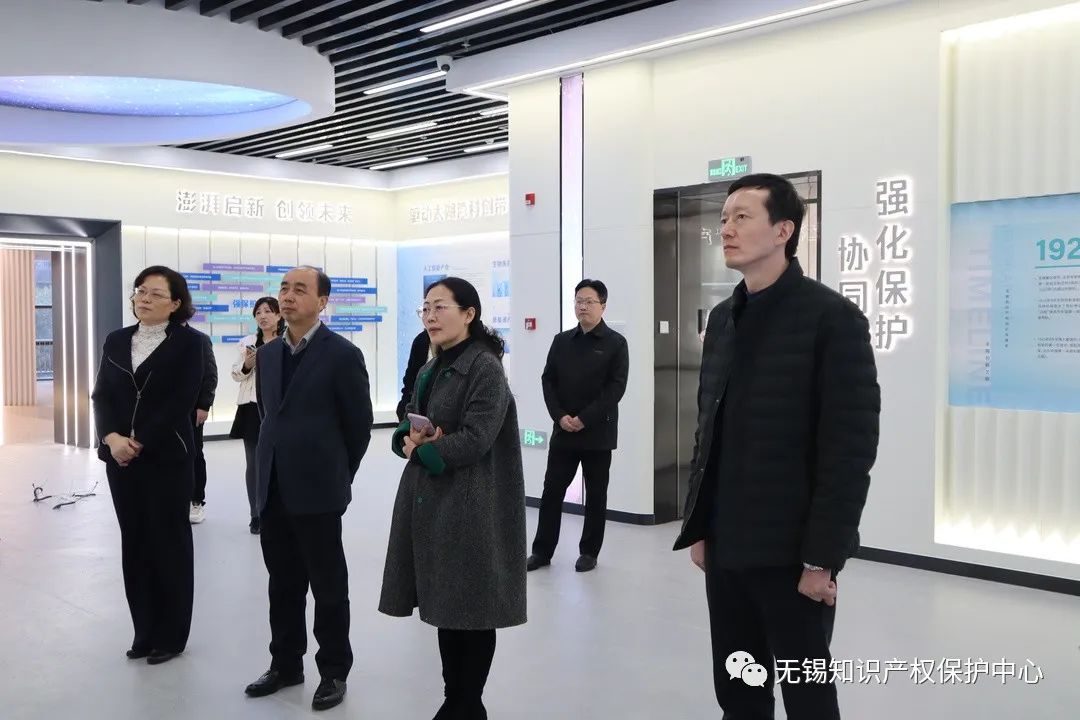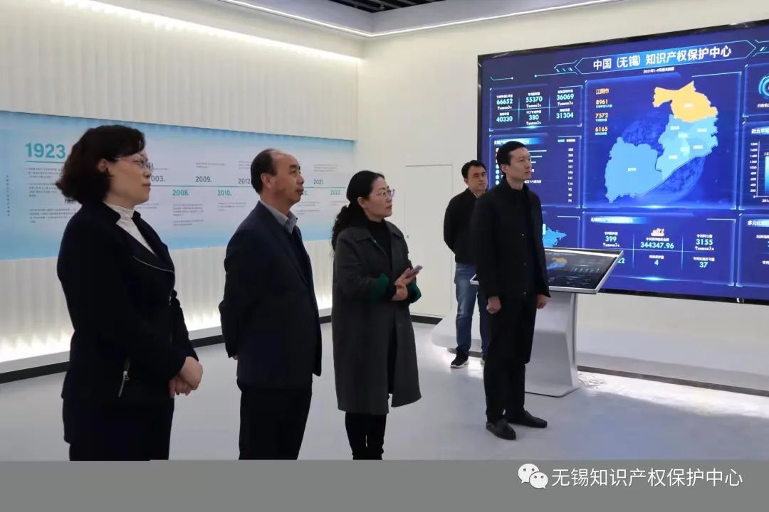 顾维中局长一行参观了无锡知识产权成果展示大厅和业务办理大厅、巡回审理庭、各业务部门等工作区域,了解无锡知识产权发展历程、中国(无锡)知识产权大数据平台、优势示范企业分布和无锡知识产权创新成果等,听取工作人员介绍中国(无锡)知识产权保护中心筹建历程、总体概况、主要职能以及前期工作开展情况。